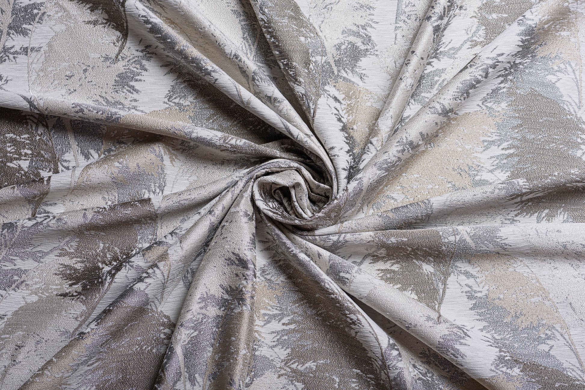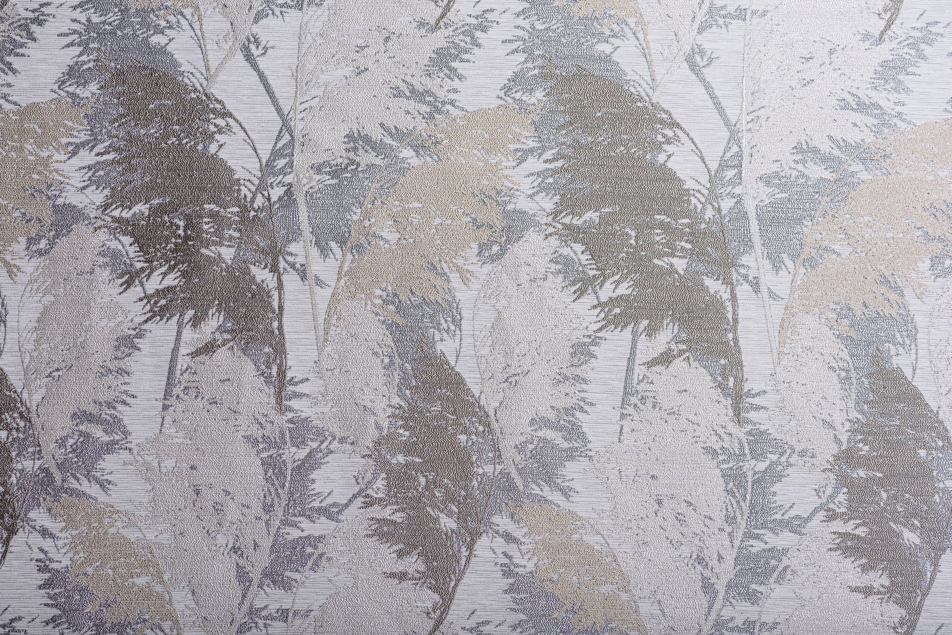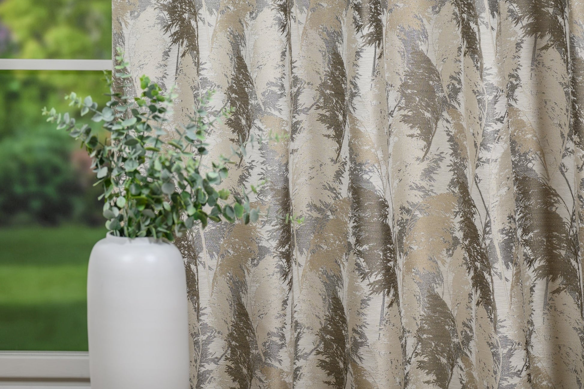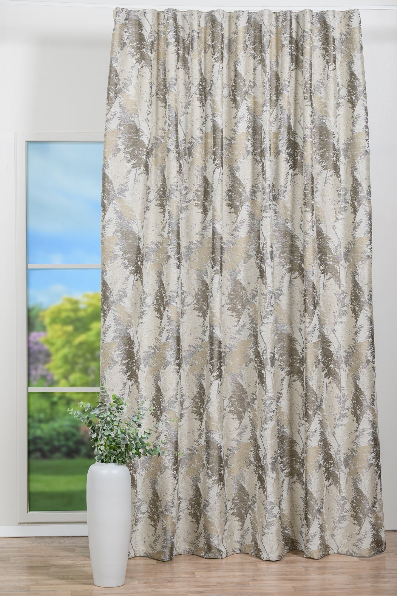 Decor Almara, Bej, este o draperie din material jacquard sidefat, decorată cu un imprimeu delicat de frunze, care adaugă un aer vegetal și romantic oricărui interior.