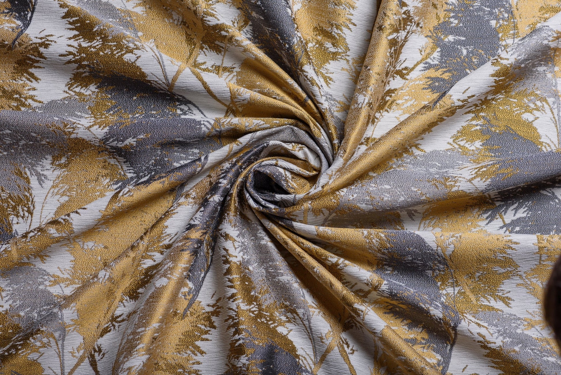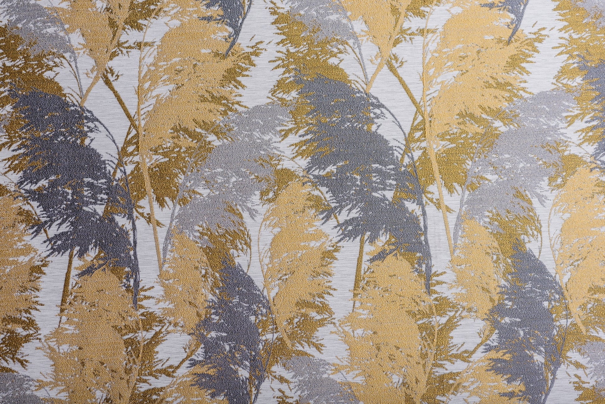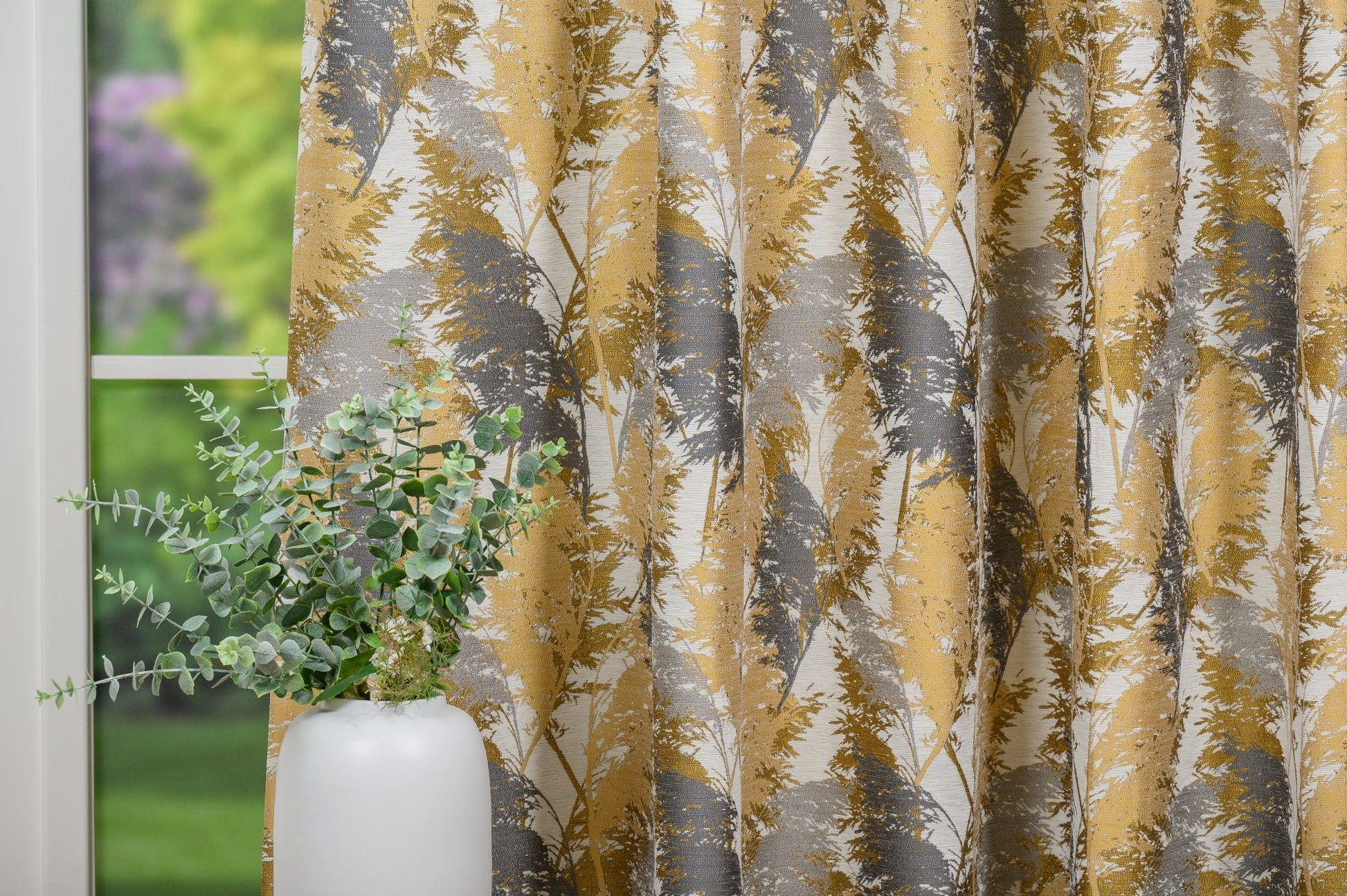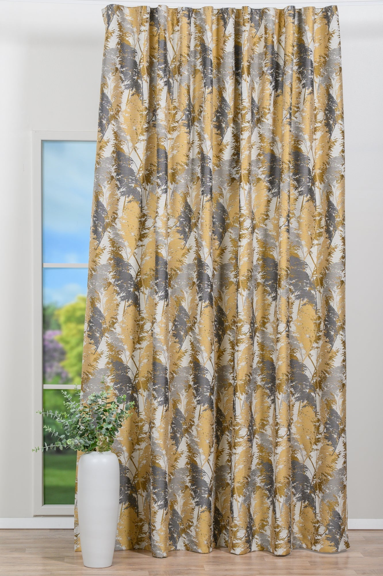 Decor Almara, Mustar, este o draperie din material jacquard sidefat, decorată cu un imprimeu delicat de frunze, care adaugă un aer vegetal și romantic oricărui interior.