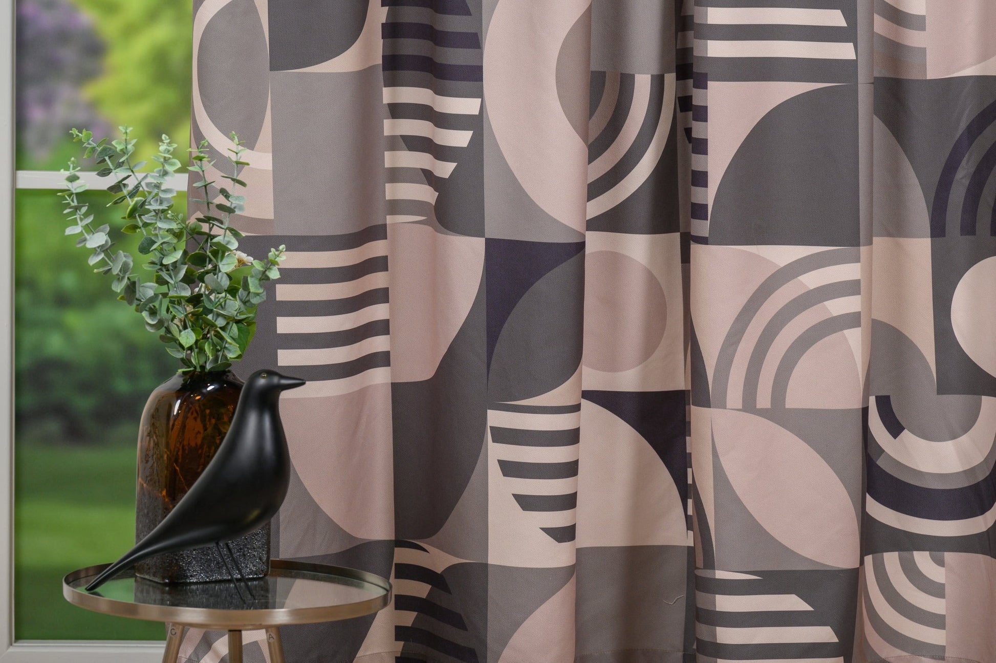 Decor Aventis, Gri, este o draperie remarcabilă, confecționată dintr-un material natural cu imprimeu, care combină un model abstract cu un stil geometric modern.