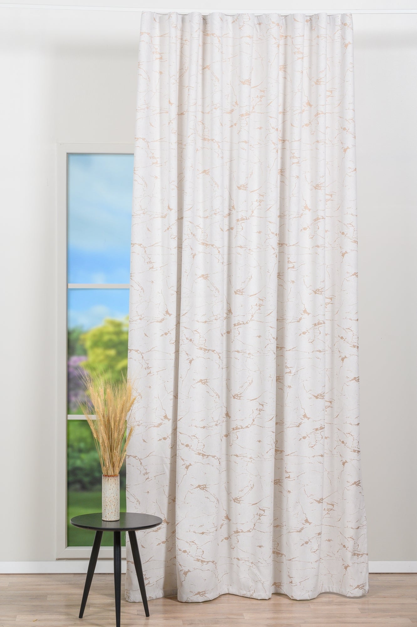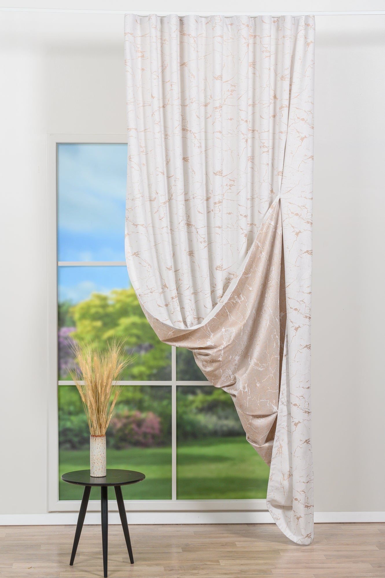 Decor Lysira, Bej, este o draperie versatilă, cu material double-faced, care permite utilizarea ambelor fețe, oferind cumpărătorului libertatea de a alege aspectul dorit.