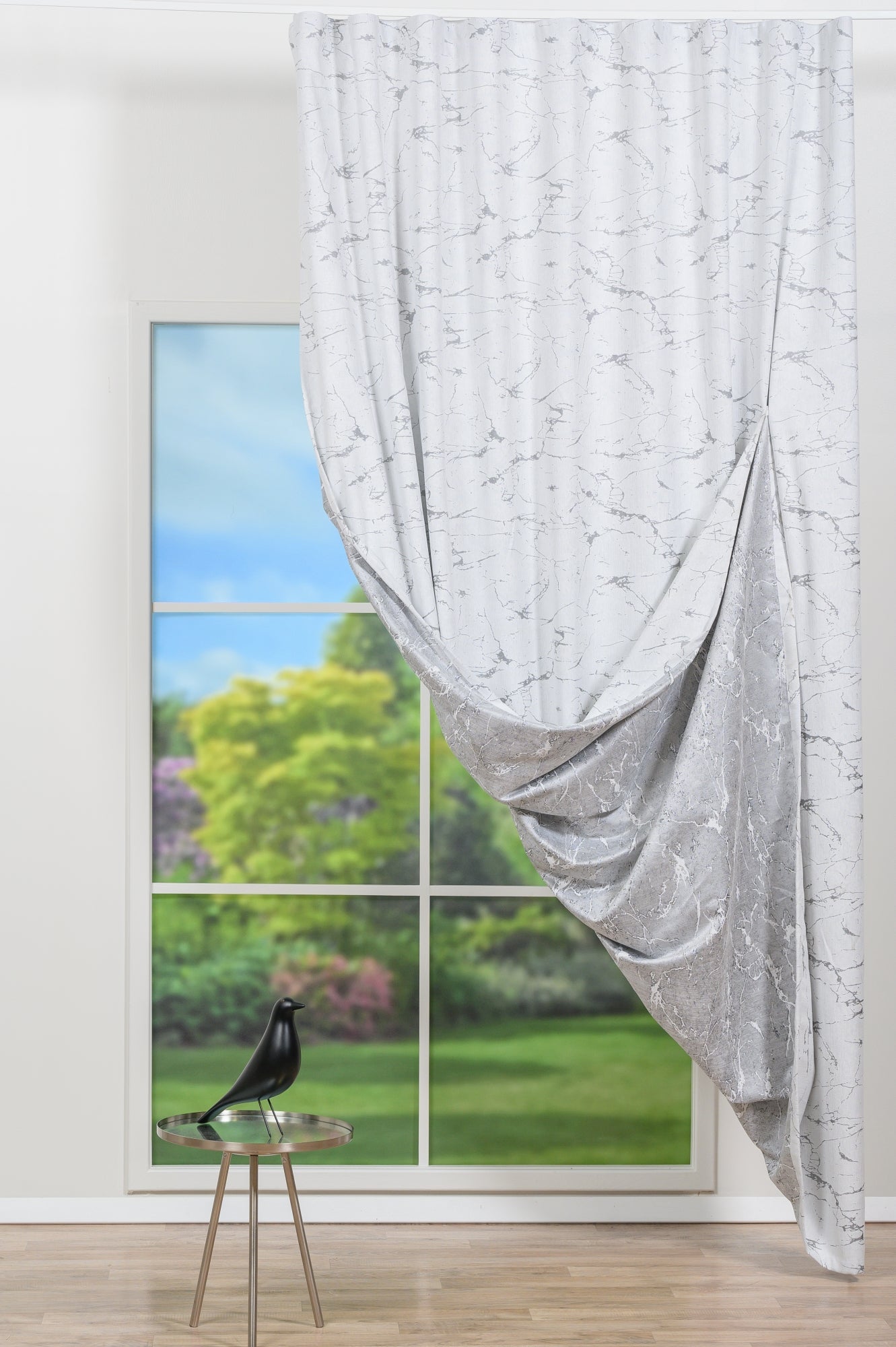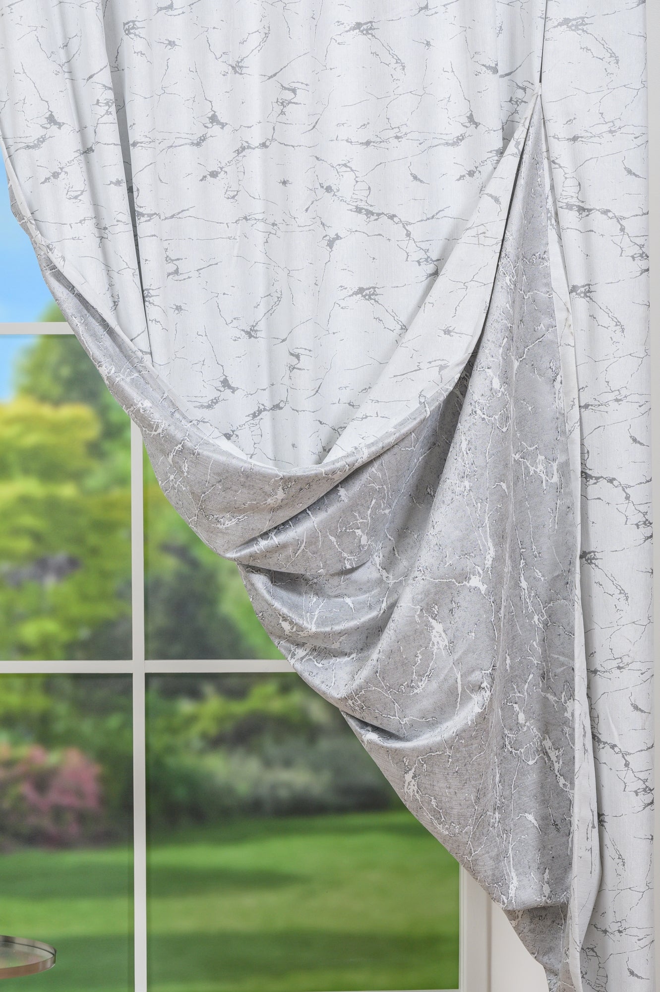 Decor Lysira, Gri, este o draperie versatilă, cu material double-faced, care permite utilizarea ambelor fețe, oferind cumpărătorului libertatea de a alege aspectul dorit.