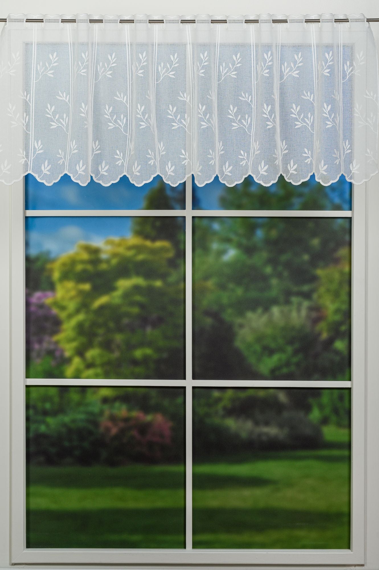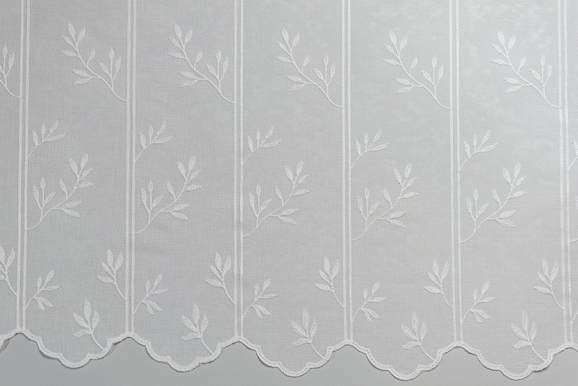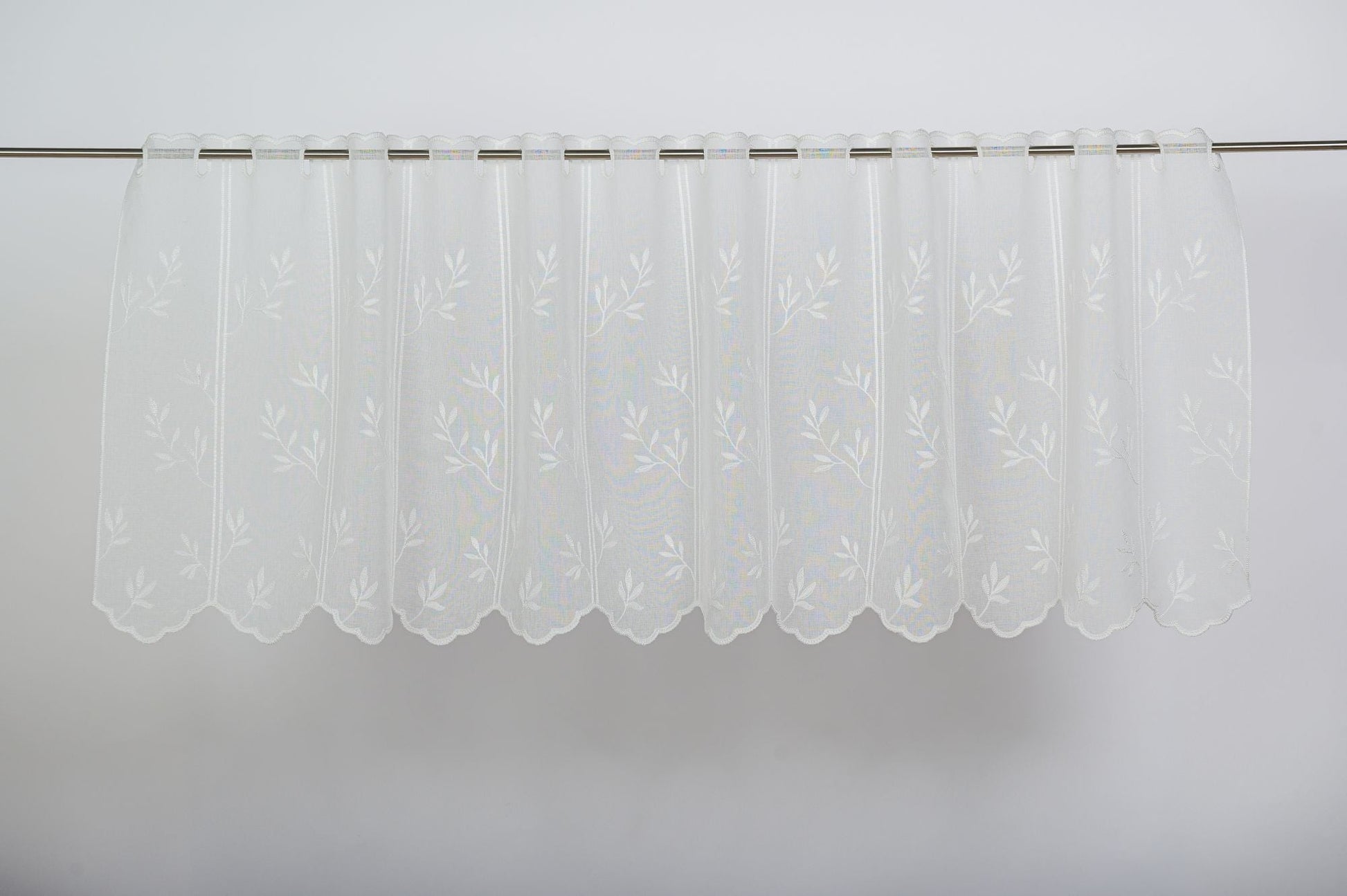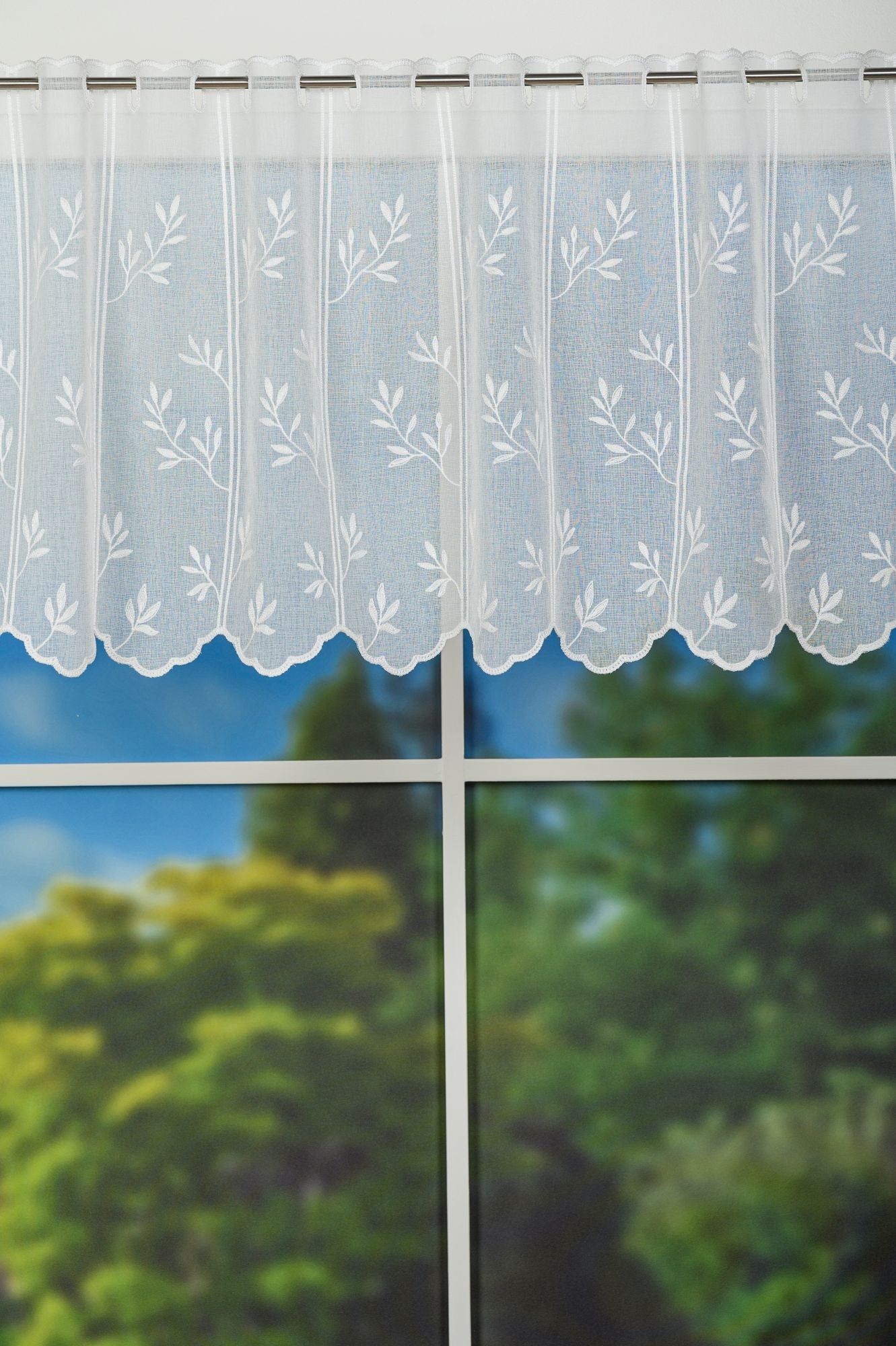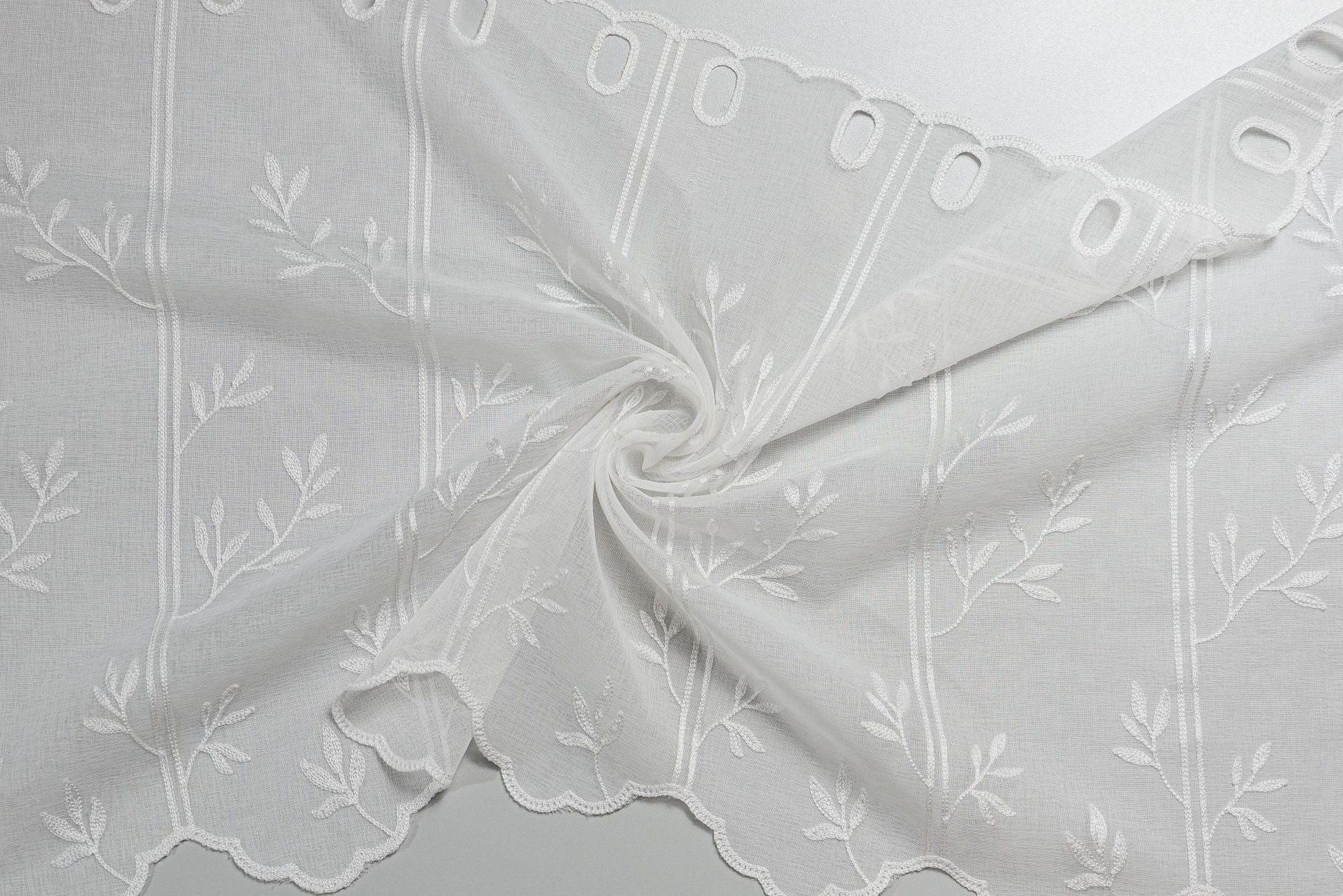 Perdea Ilyana, Alb, este o perdea pentru bucatarie cu broderie si model floral perfecta pentru decorarea ferestrei de la bucatarie.