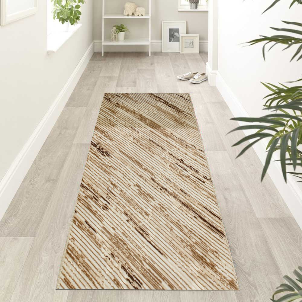 Traversa Antiderapanta Aldo Dungi Maro impresionează printr-un design modern, cu un model format din dungi diagonale în nuanțe de maro și bej. Acest stil oferă un aspect dinamic și sofisticat, adăugând profundime și textură oricărui spațiu.