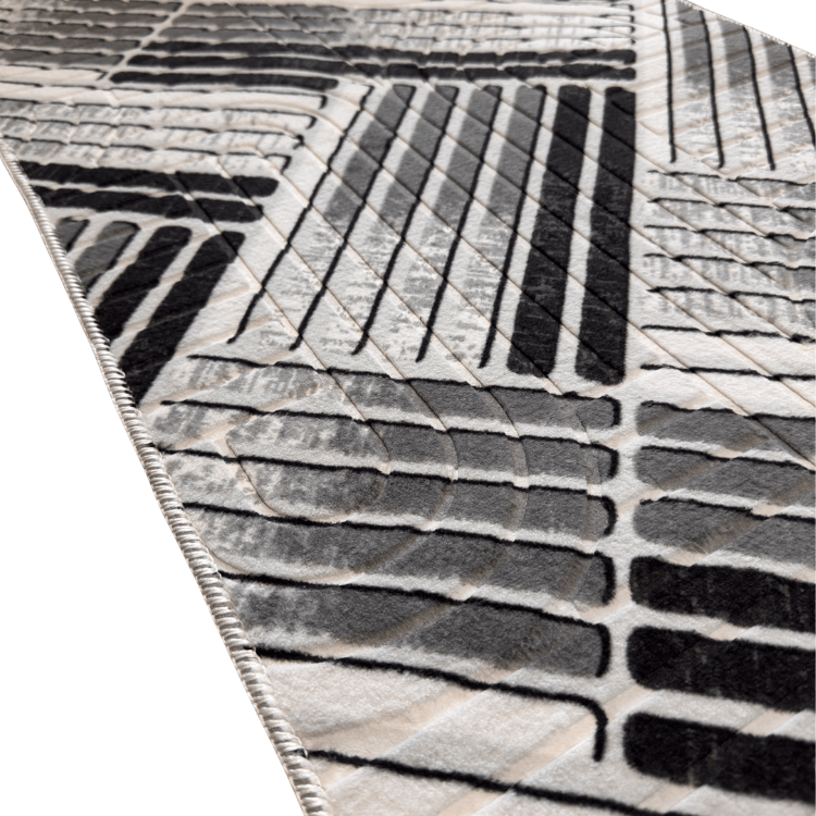 Traversa Orient Gri impresioneaza printr-un design geometric modern, cu linii dinamice si un joc elegant de contraste in nuante de gri, antracit si alb, potrivit pentru interioare contemporane si minimaliste.